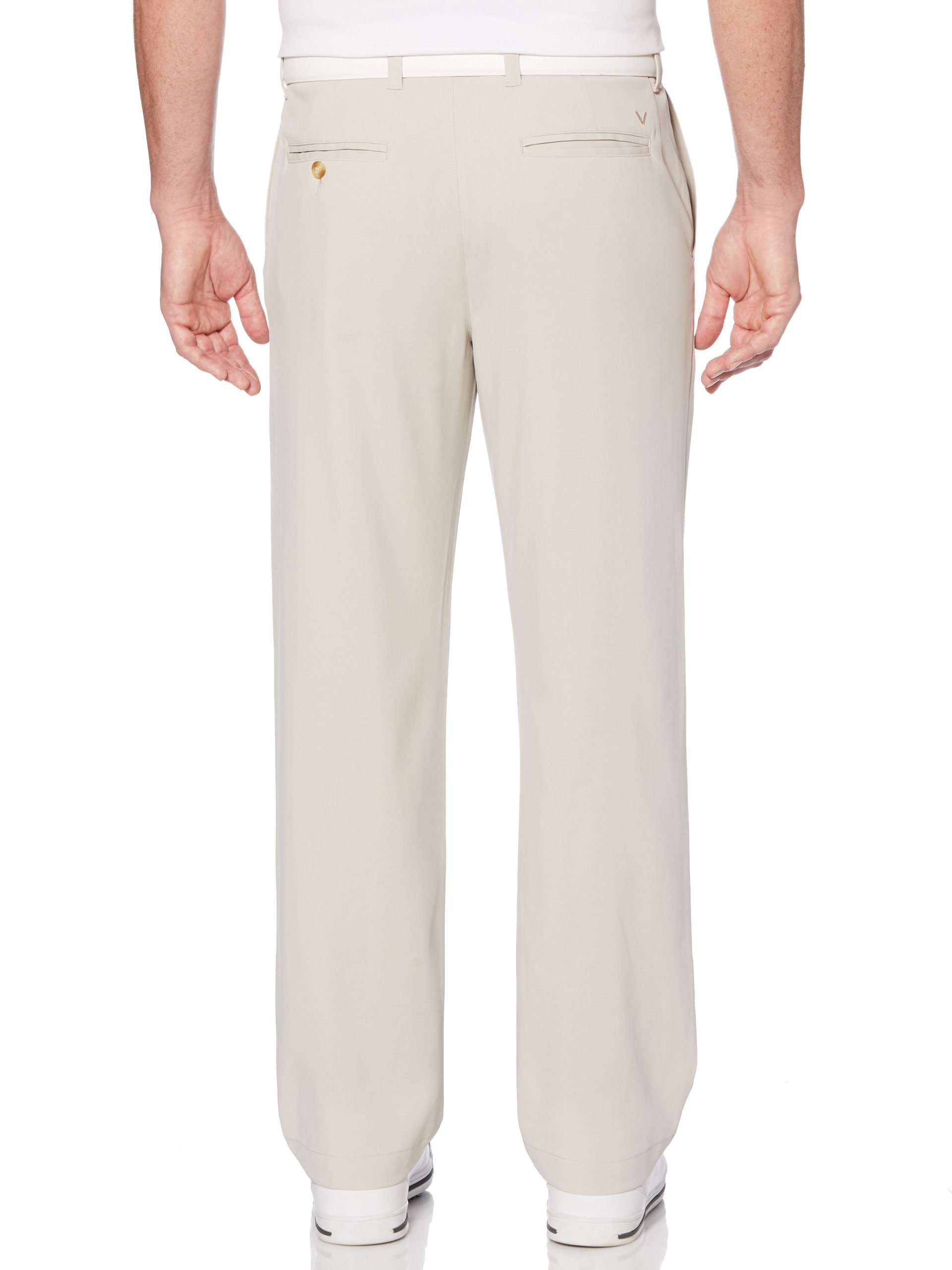 These Callaway men’s golf pants are equipped with an active waistband that moves with you while gripping your shirt to keep it tucked in. The durable fabric features built-in flex for an enhanced range of motion. Opti Dri? moisture wicking technology built into our big and tall golf pants pulls sweat away from the body for on-course comfort throughout your round. These comfortable golf pants have a flat front and handy belt loops and offer sun protection fabric against the sun’s harmful rays.