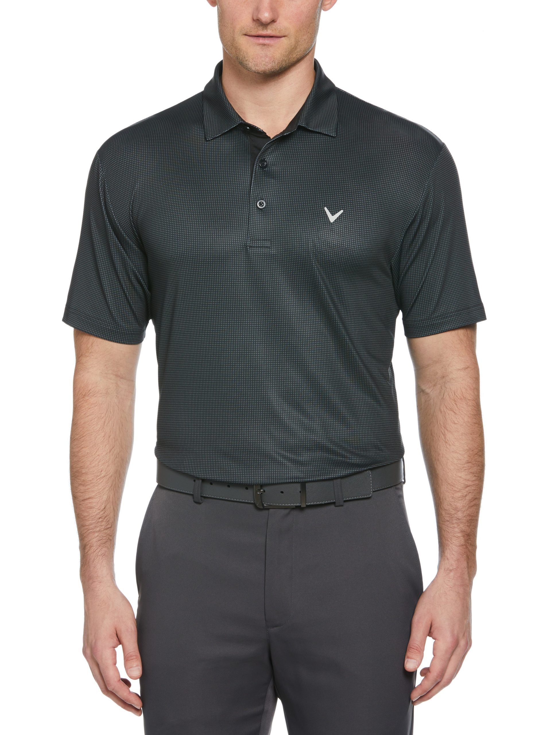 Equal parts casual and sophisticated. this classic men’s polo shirt from Callaway transitions effortlessly from lunch with coworkers to a sunny round of golf. The men’s golf shirt is crafted from a soft. lightweight jersey knit. with moisture-wicking technology to help keep you feeling fresh and dry. The fabric has sun protection to help guard against damaging UV rays. while added stretch lets you make each swing comfortably and without feeling constricted. It’s topped off with the Callaway chevron logo at the left chest and a self-fabric collar that creates a clean. unified look.