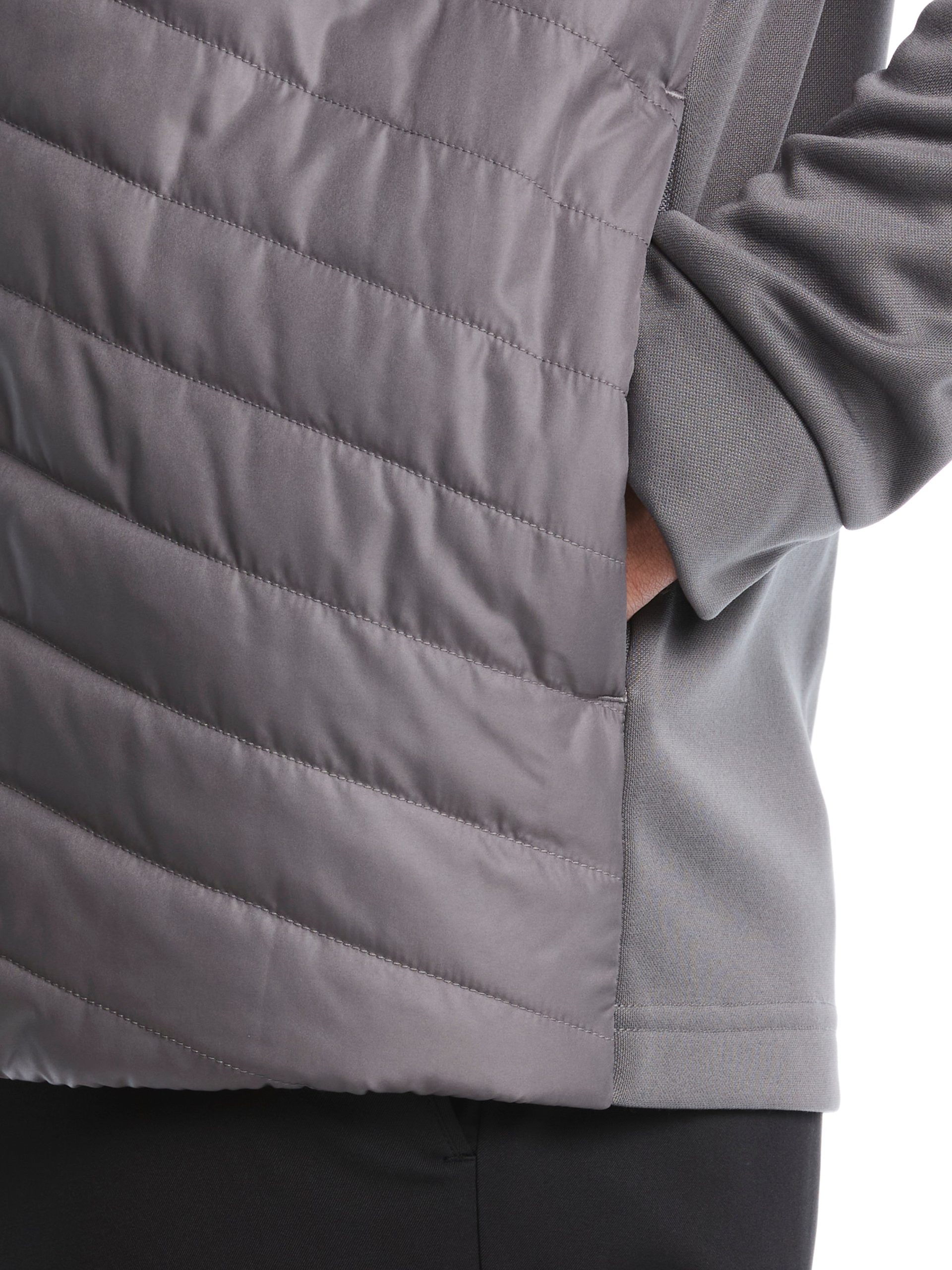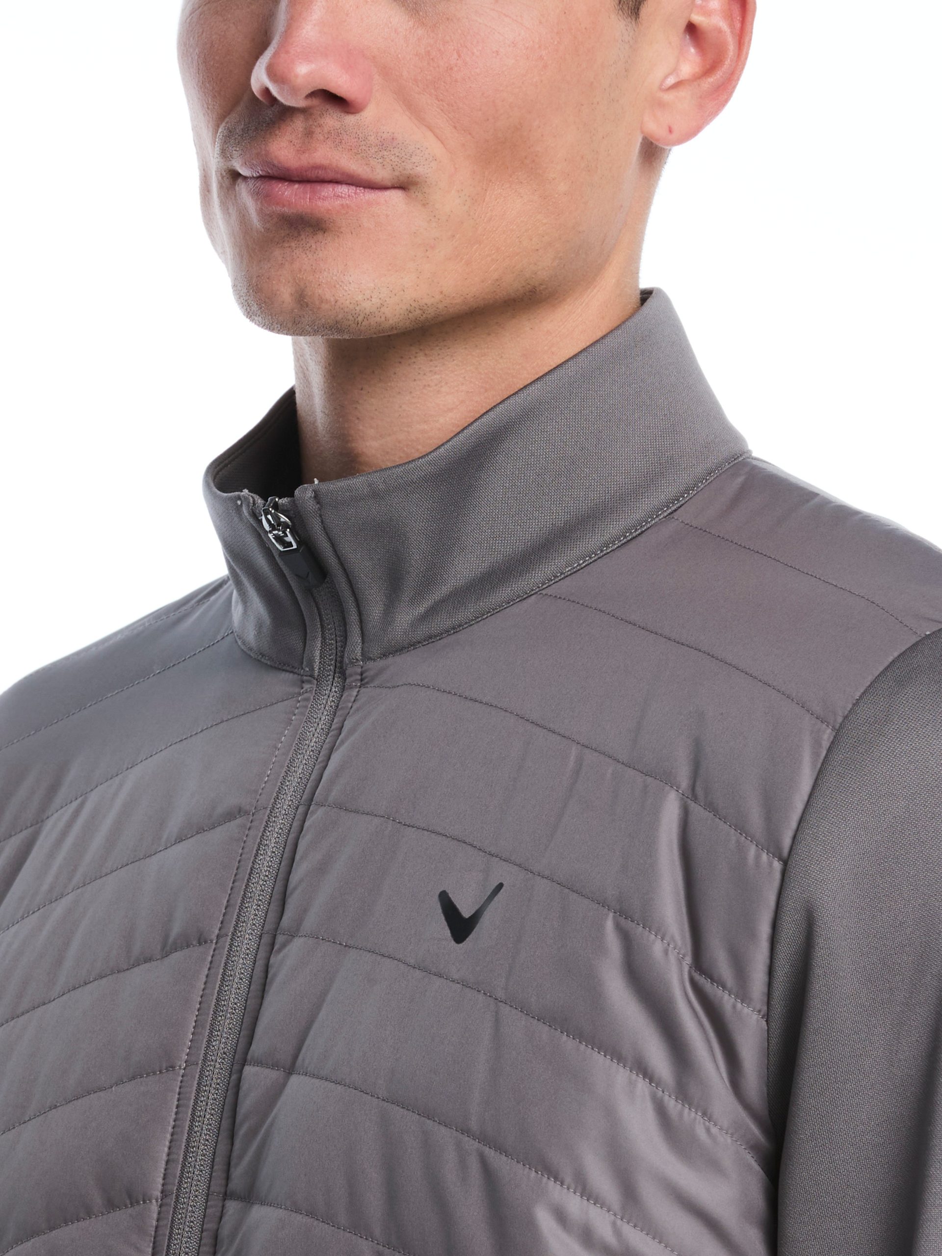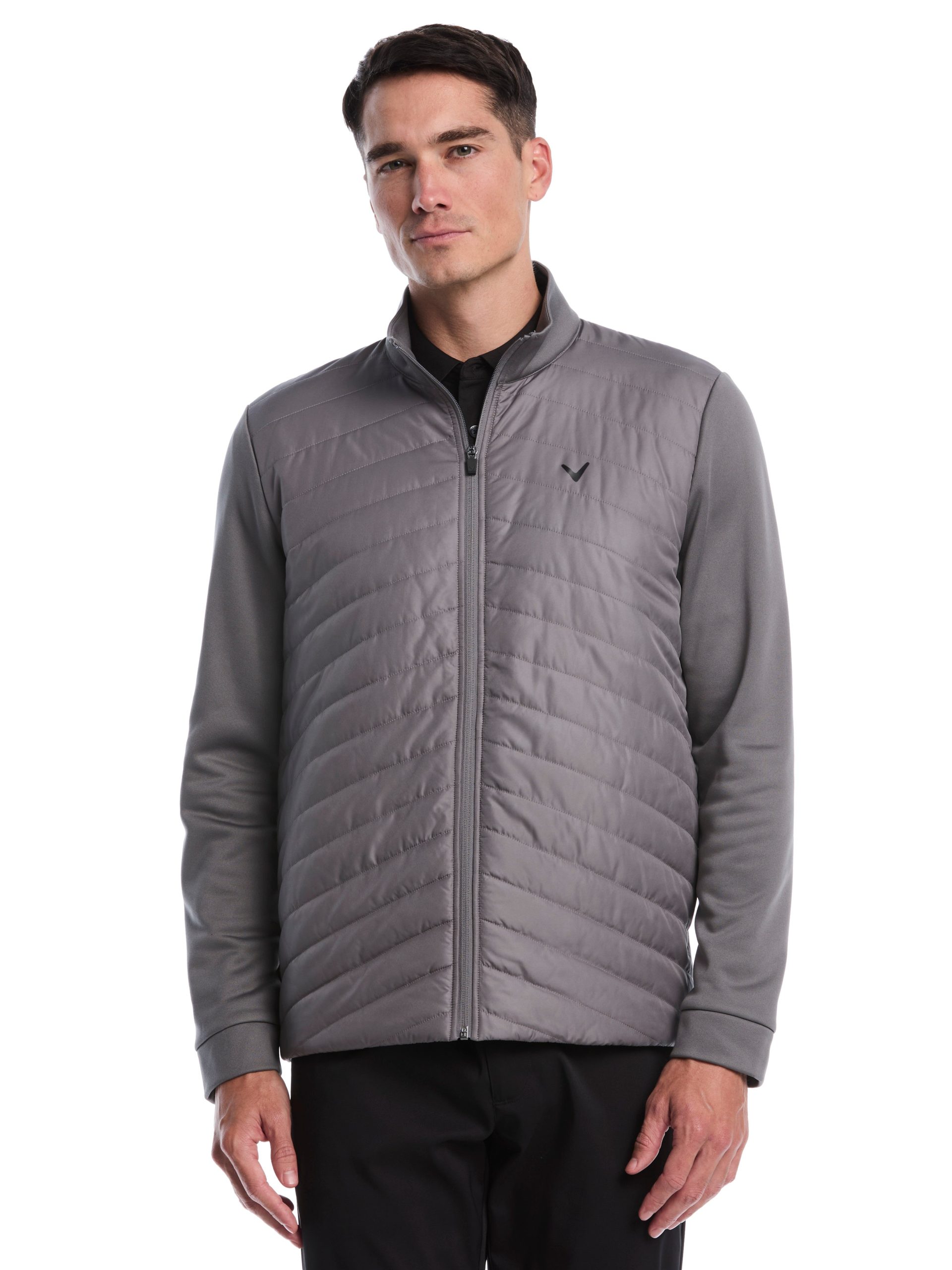 This men’s golf jacket from Callaway Apparel is ideal for cold days. Its quilted front panel provides lightweight warmth. while durable plain weave fabric offers built-in sun protection. Partially lined for comfort. this full-zip jacket has a solid design that’s easy to pair. Zippered front pockets offer secure storage for essentials on or off the course.