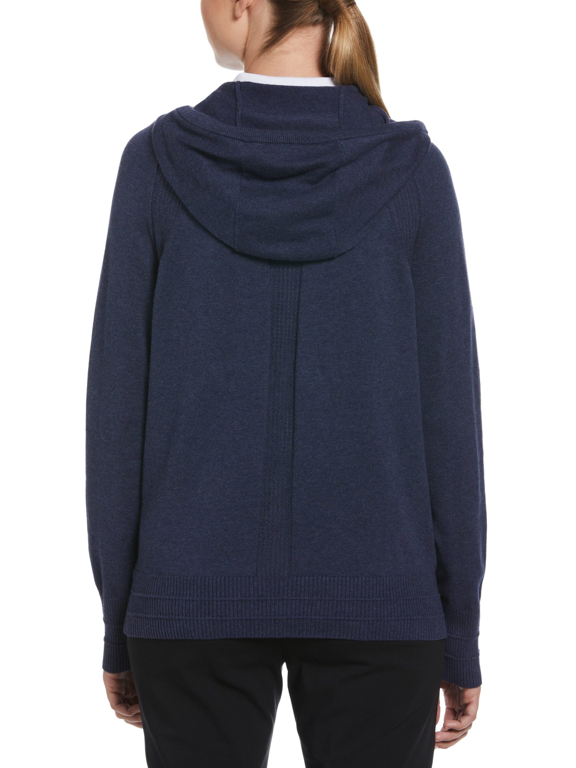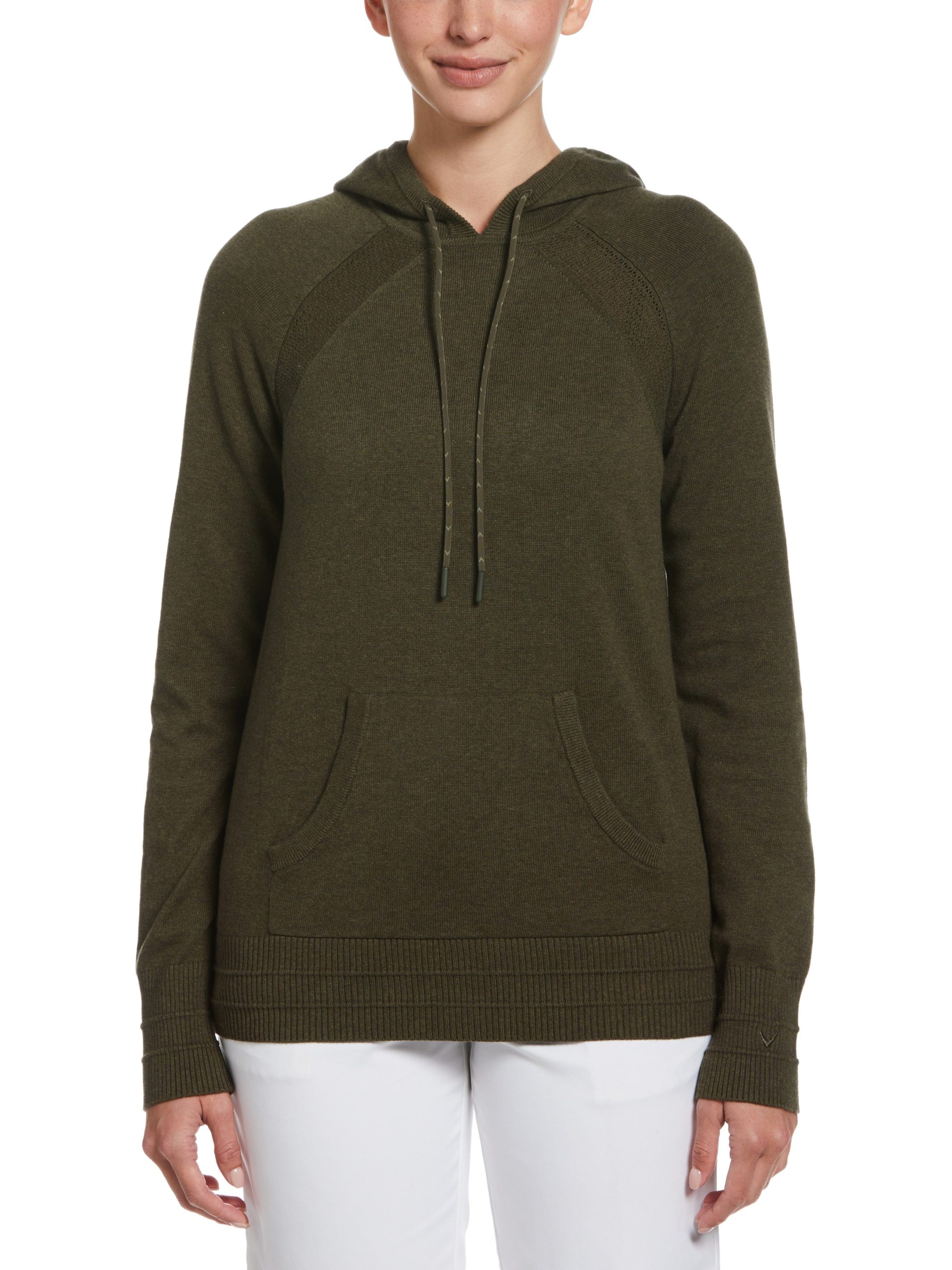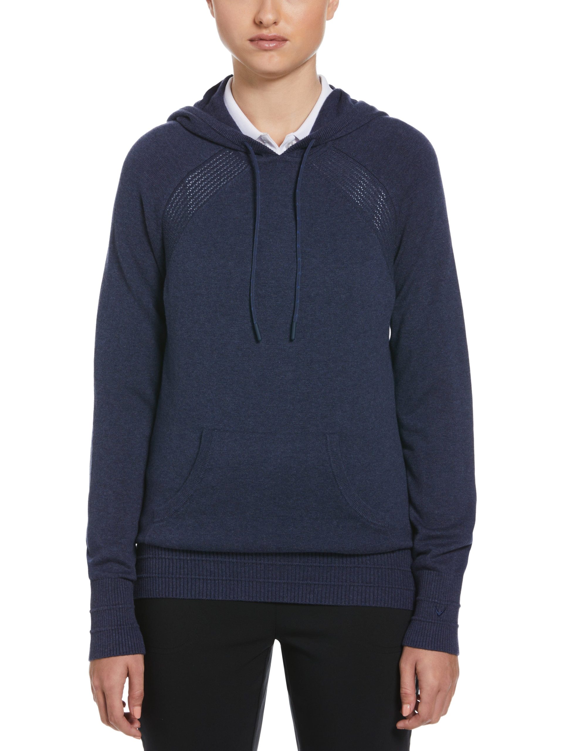 Bring cozy warmth to your golf attire with this versatile women’s hoodie from Callaway’s Weather Series?. The golf sweater is made with an extra soft fabric that’s great for everything from practicing your swing at the course to simply lounging at home. The fabric is heathered for a two-toned. modern look. and accents like a chevron drawcord on the hood and pointelle stitch detailing at the shoulders and center back add some extra style points. A kangaroo pocket provides space for storage or to warm your hands. An eco-friendly option. the golf pullover is made using 25% recycled nylon to help conserve natural resources.